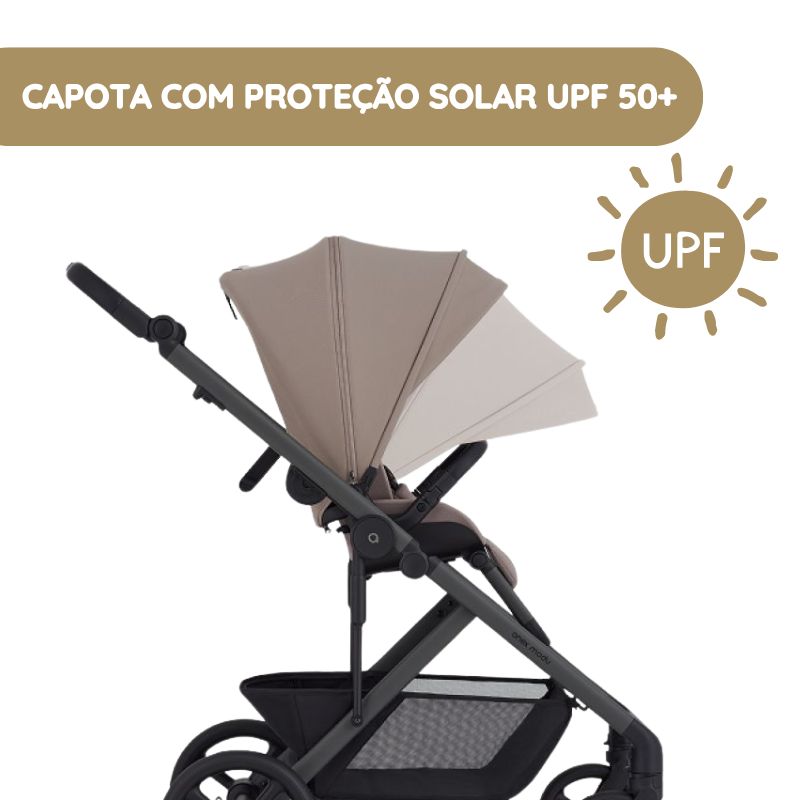 Tecidos repelentes à água (índice superior a 80) e com proteção solar UPF 50+, ideais para o clima em Portugal e para uso durante todo o ano. - Adequado desde o nascimento