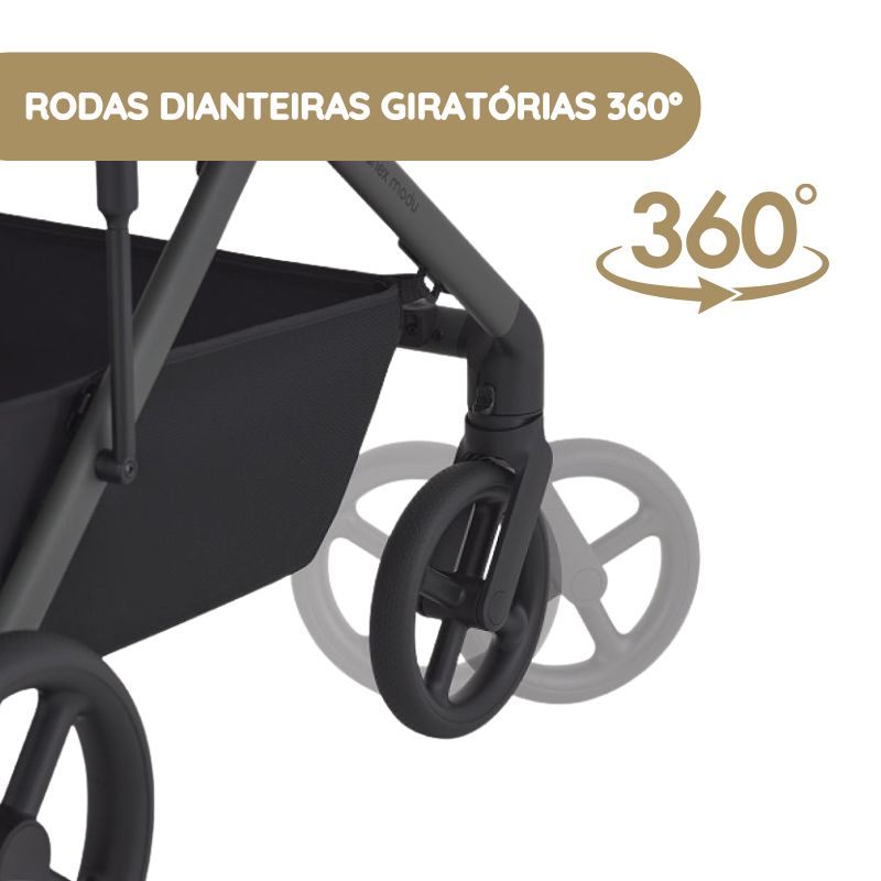 Produzidas com tecnologia líder de mercado, as rodas Flexi em PU são mais leves e macias, oferecendo melhor amortecimento, durabilidade e conforto ao bebé. - Rodas dianteiras giratórias a 360° com bloqueio