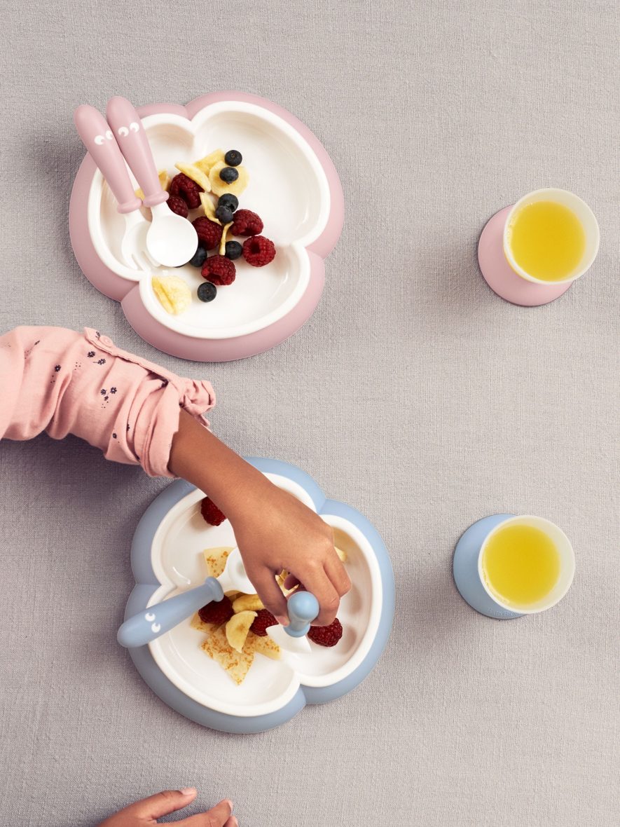 O formato em trevo do prato facilita a recolha dos alimentos, enquanto a base evita que o prato deslize. A colher e o garfo são moldados para não deslizar para dentro do prato, e os cabos curtos são fáceis de agarrar pelas mãos pequenas do bebé. O copo é estável, fácil de segurar e o seu conteúdo pode ser visto através do plástico fosco.