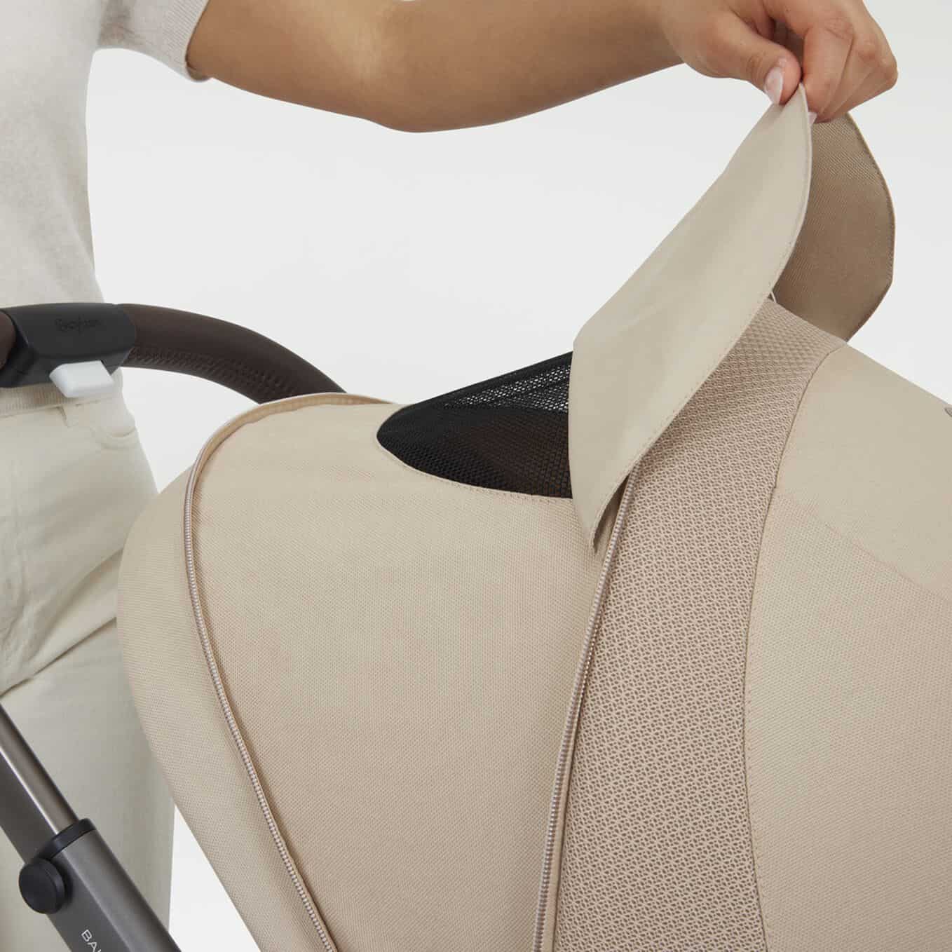 • Capota XXL com inserção de malha ventilada: proteção solar e circulação de ar.