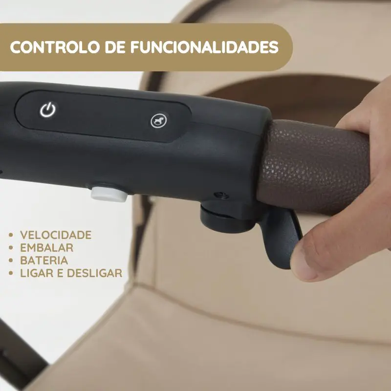 Através de uma alavanca elétrica, o carrinho ajusta a potência, garantindo um passeio descontraído mesmo com dois bebés ou carga adicional.