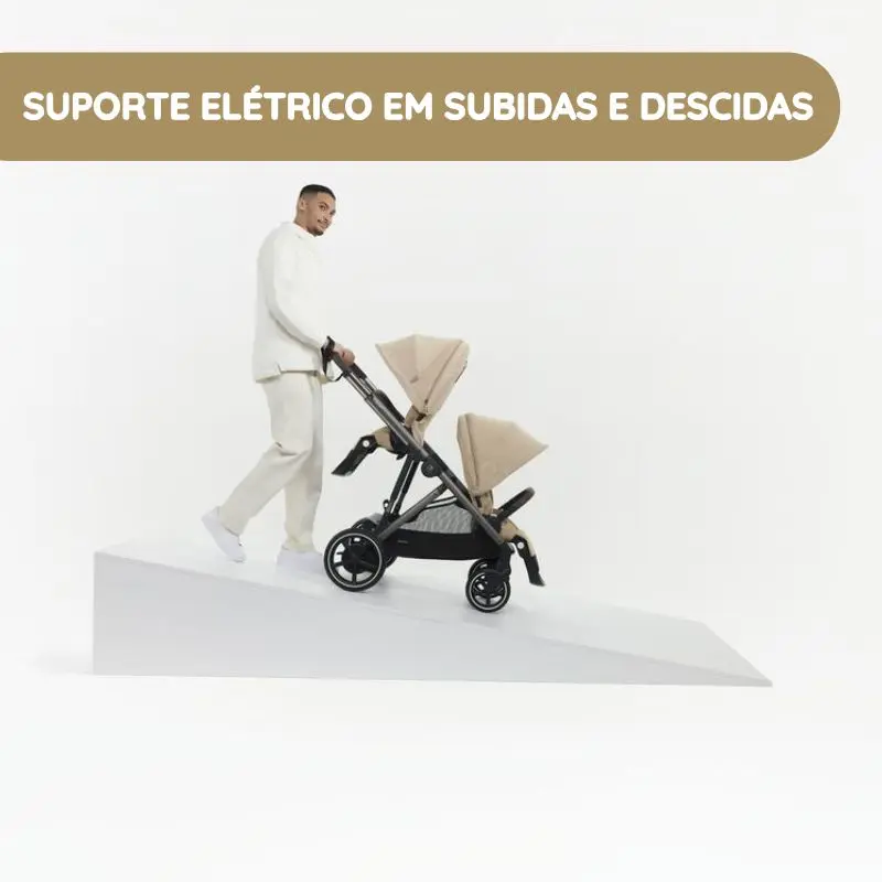 Através de uma alavanca elétrica, o carrinho ajusta a potência, garantindo um passeio descontraído mesmo com dois bebés ou carga adicional.