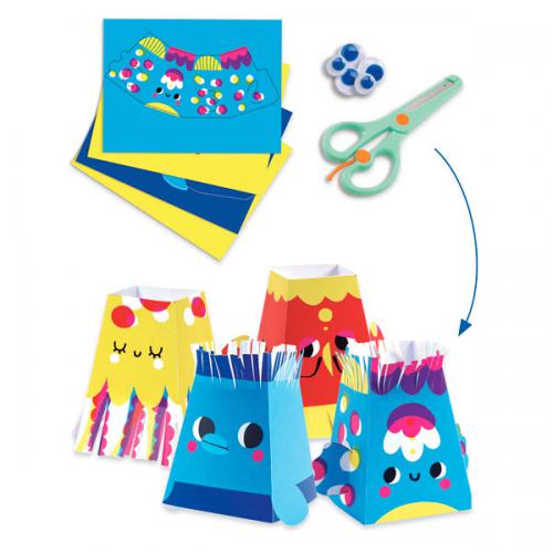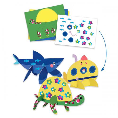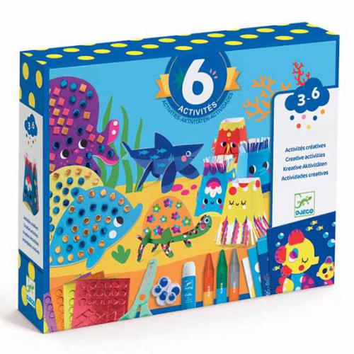 Várias crianças podem criar juntas. Perfeito para aniversários ou para a sala de aula. Desenvolve a destreza, a motricidade, a precisão e criatividade, promovendo a aprendizagem de cores, formas, tamanhos e volumes. IncluI: colagem: 1 cartão ilustrado (21 x 28 cm), 2 placas de cartão grosso pré-cortadas, 6 pompons, 2 olhos móveis, 1 tubo de cola. Páginas para colorir: 2 cartões ilustrados (21 x 28 cm), 1 folha de autocolantes, 3 lápis de cera frente e verso (6 cores). Recortes: 4 folhas ilustradas (21 x 28 cm), 1 tesoura de segurança, 8 olhos móveis. Mosaicos: 2 placas com silhuetas grossas (21 x 28 cm), 3 folhas de adesivos de mosaico em espuma metálica. Decalque: 1 cartão grande ilustrado (28 x 63 cm), 2 folhas de decalque. Totens: 3 folhas de cartão grosso ilustradas e pré-cortadas, 1 folha de autocolantes (21 x 28 cm).