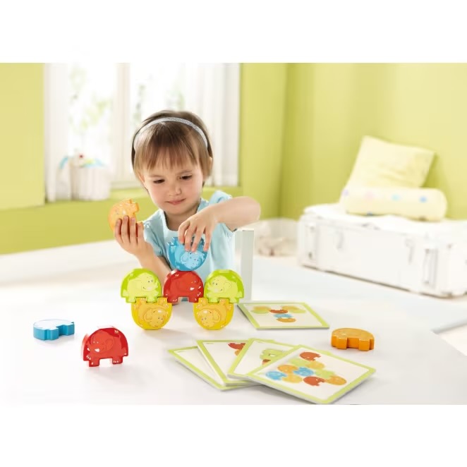 Os dez bobbleheads coloridos da HABA podem ser empilhados de forma muito divertida. As possibilidades são muitas, e até as construções arrojadas ficam de pé porque pernas, corpo e tronco interligam-se. Mas as crianças não podem simplesmente experimentar e empilhar como quiserem… em cinco modelos de cartões impressos frente e verso, encontrarão tarefas de dificuldade variada para recriar.