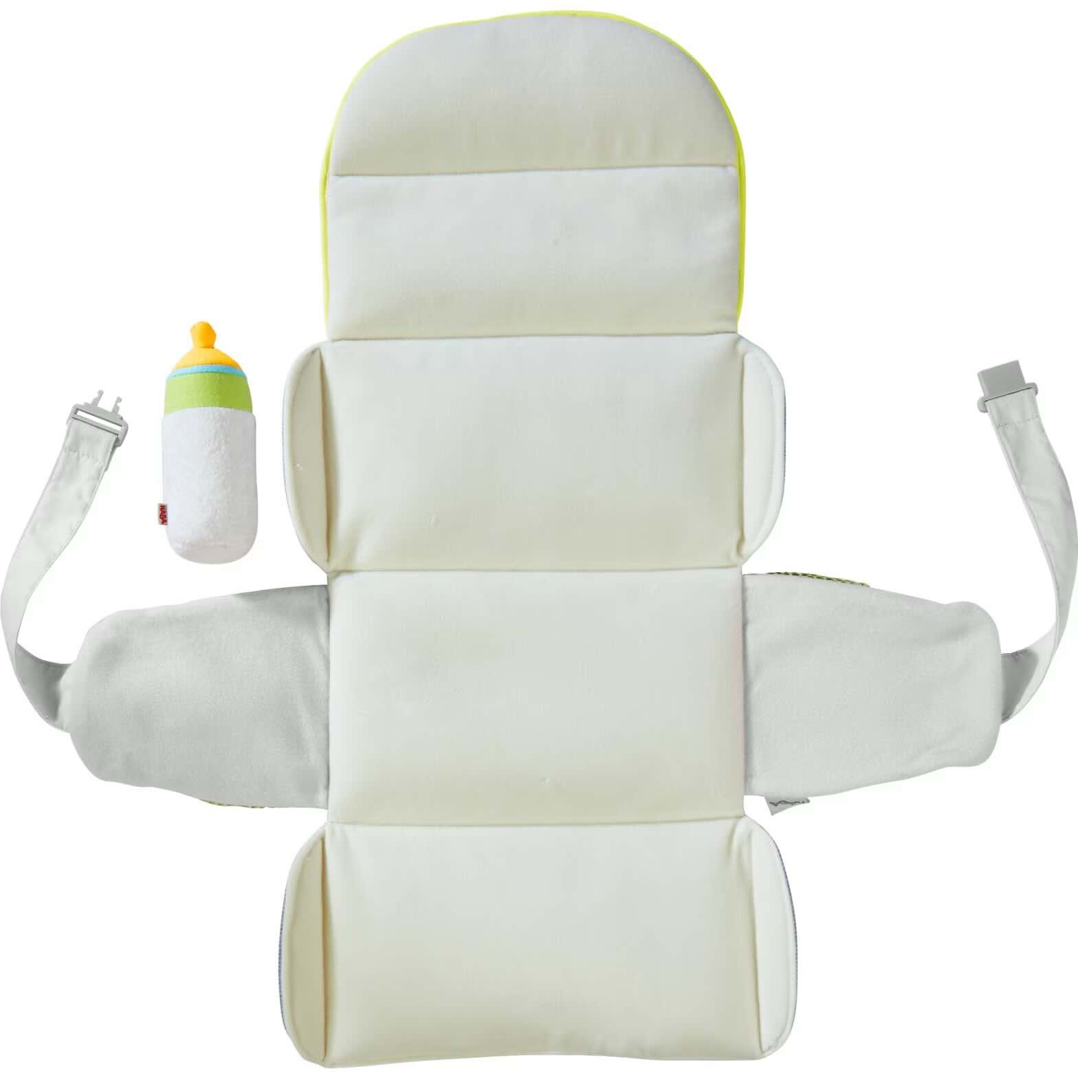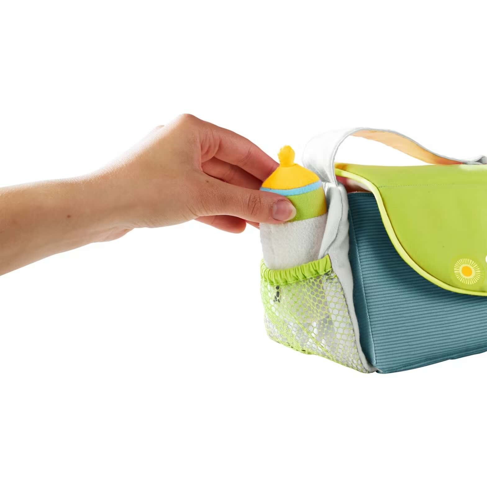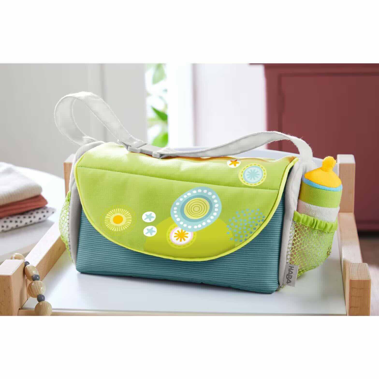 O brinquedo de tecido realista pode ser lavado na máquina a 30°. A bolsa de fraldas para bonecas bem desenhada faz parte da série mágica HABA Summer Meadow.