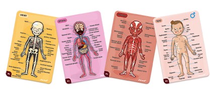 Inclui 4 cartas com informações detalhadas sobre o seguinte: O esqueleto, órgãos, músculos e as diferentes partes do corpo humano (traduzido para o francês, inglês, alemão, holandês, espanhol, catalão, basco, italiano, russo, dinamarquês e japonês). Inclui um indicador de madeira.