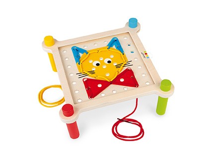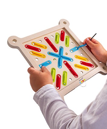Para iniciantes: usar o cadarço para acompanhar os contornos dos desenhos e entrelaçar com as duas mãos, com as pernas aparafusadas na plataforma. Para os mais experientes: colocar as fichas da cor certa para preencher o desenho ou entrelaçar com uma mão, sem as pernas da plataforma. Será preciso paciência e concentração para fazer os 10 padrões neste jogo de entrelaçamento e reconhecimento de cores. Fornecido com 10 folhas de modelo, 70 fichas e 4 cabos de cores diferentes. Este produto desenvolve: habilidades motoras finas, concentração. Peças pintadas com tinta à base de água