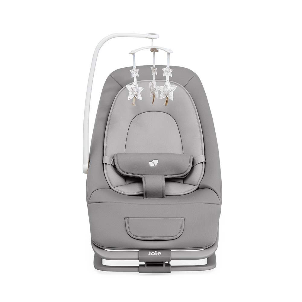 Joie Espreguiçadeira Dreamer: espreguiçadeira e baloiço versátil desde o nascimento até ~15 kg com vibrações suaves, sons calmantes, brinquedos interativos e fecho compacto. Conforto e entretenimento em casa ou em viagem.
