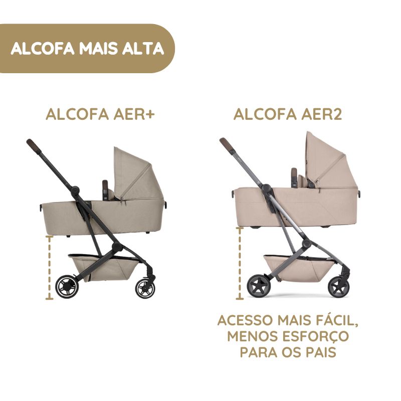 A Alcofa Aer2 é espaçosa e ergonómica oferecendo conforto máximo, ideal tanto para sonecas rápidas como para noites inteiras, já que é aprovada para pernoitar. A capota solar super extensível com proteção UV FPS 50+ garante sombra e ventilação, criando um ambiente acolhedor em qualquer estação do ano.