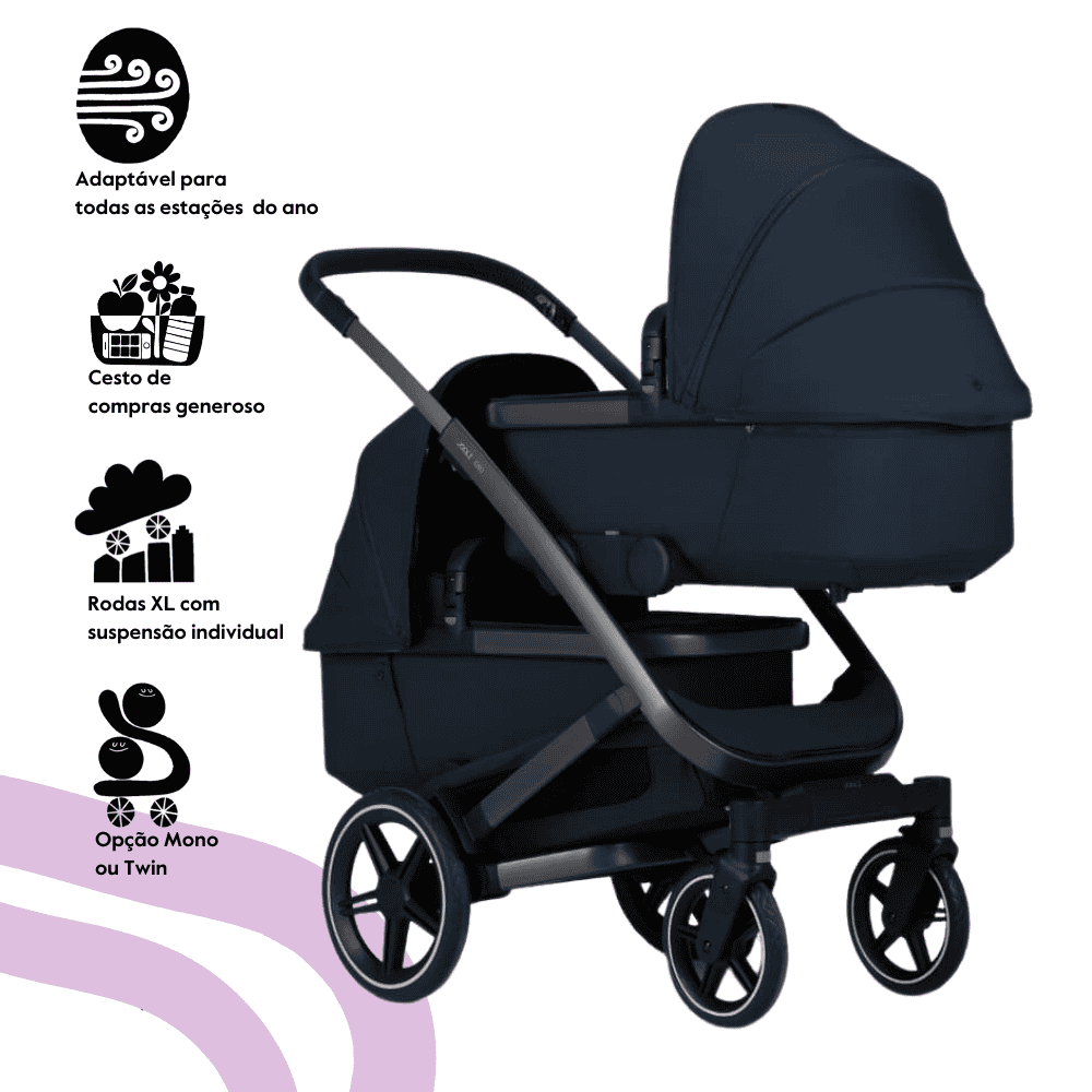 Com um design elegante e funcional, o Geo3 Twin desliza suavemente por qualquer caminho – seja uma rua movimentada ou um trilho no parque. A sua estrutura robusta mas compacta permite manobrar sem esforço, enquanto as rodas XL com suspensão individual e à prova de furos garantem passeios tranquilos, independentemente do terreno.