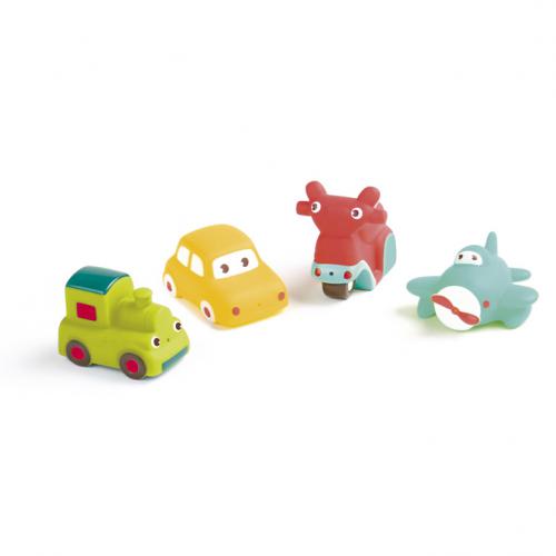 4 brinquedos de banho, simples, com cores bonitas e várias personagens. Estes simpáticos veículos flutuam e proporcionam brincadeiras divertidas graças ao pequeno orifício por onde esguicha a água. O seu design colorido, especialmente pensado para mãos pequenas, é feito de plástico macio e resistente para massajar as gengivas dos bebés que adoram levá-los à boca.