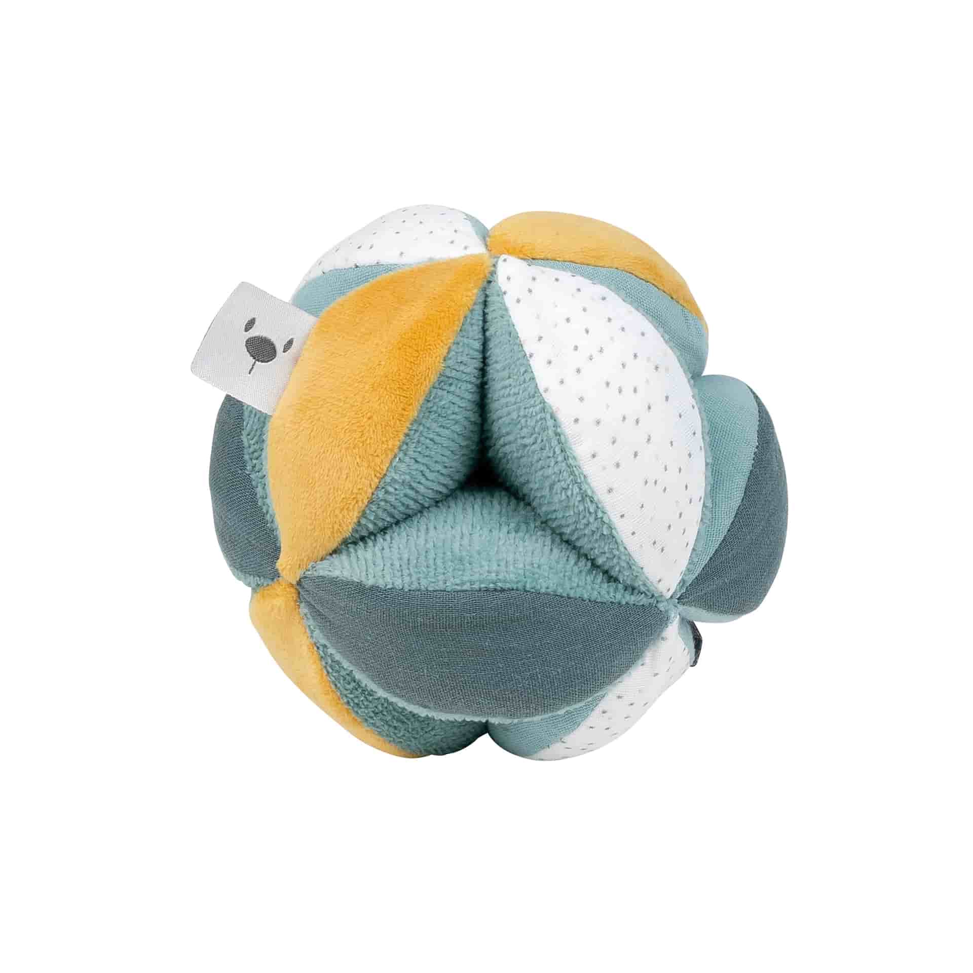 Bola com quatro sugestões de atividades para explorar: chocalho, guizo, papel triturado e experiências táteis diversas. Ofereça diferentes texturas para enriquecer a experiência sensorial.