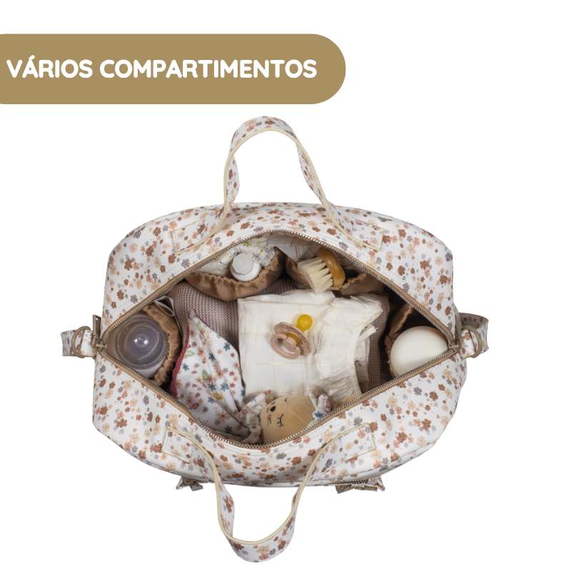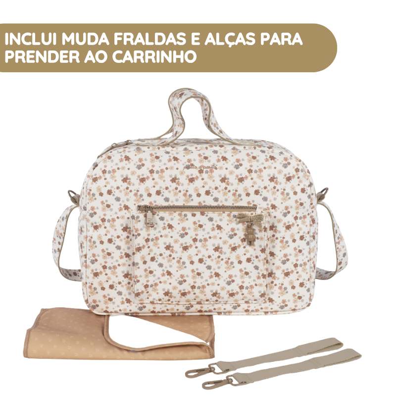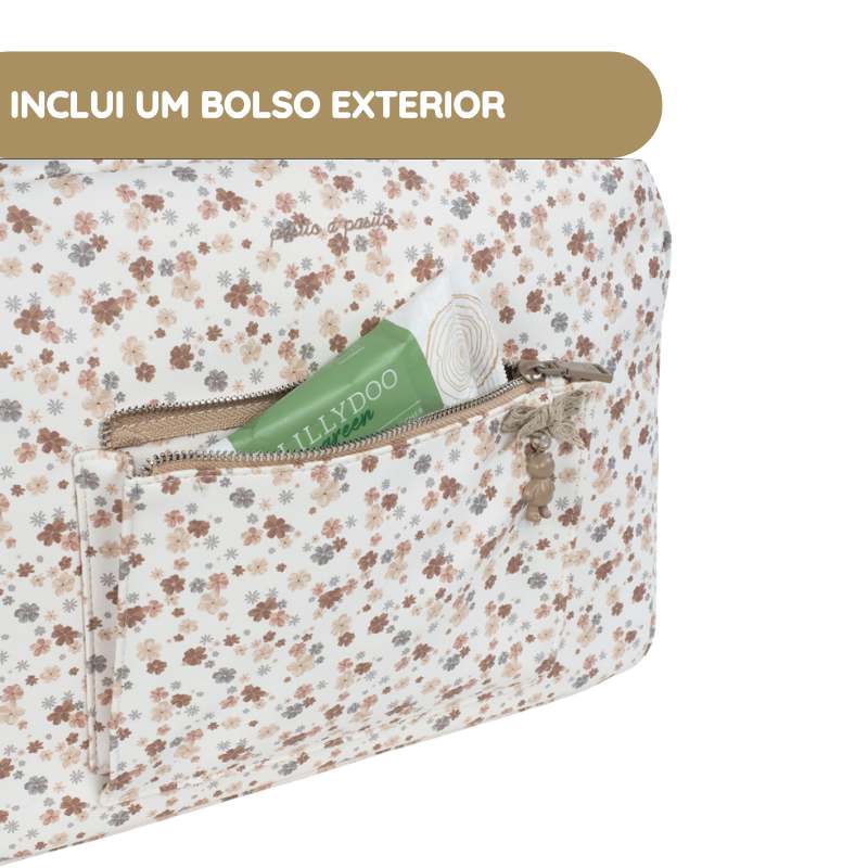 No interior, conta com vários bolsos que facilitam a organização, um bolso térmico ideal para manter biberões à temperatura correta e um bolso impermeável para guardar roupas molhadas em total segurança. Inclui ainda um muda-fraldas portátil para que esteja sempre preparado em qualquer situação. No exterior, tem um bolso com fecho e outros compartimentos que permitem acesso rápido aos objetos mais usados.