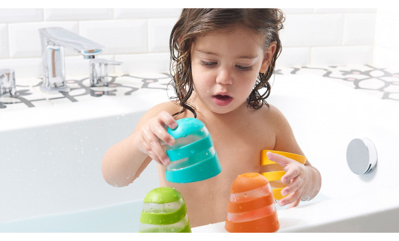 PROMOVE A COGNIÇÃO: À medida que as crianças brincam com os copos desfrutam dos 5 diferentes efeitos de aspersão, equilibram e empilham-nos na beira do banho, etc.
