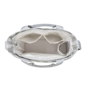 O seu interior é pensado para máxima organização: tem bolso plastificado para roupa húmida, bolso térmico para manter o biberão à temperatura ideal e dois bolsos adicionais para tudo o que precises ter à mão. Um charme em forma de coração permite personalizar o acessório com o nome do teu bebé, tornando-o ainda mais especial.