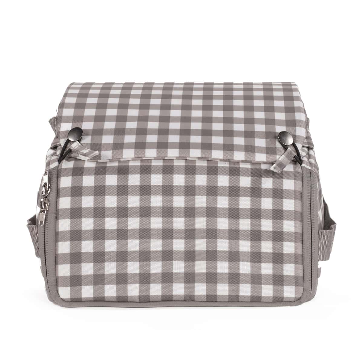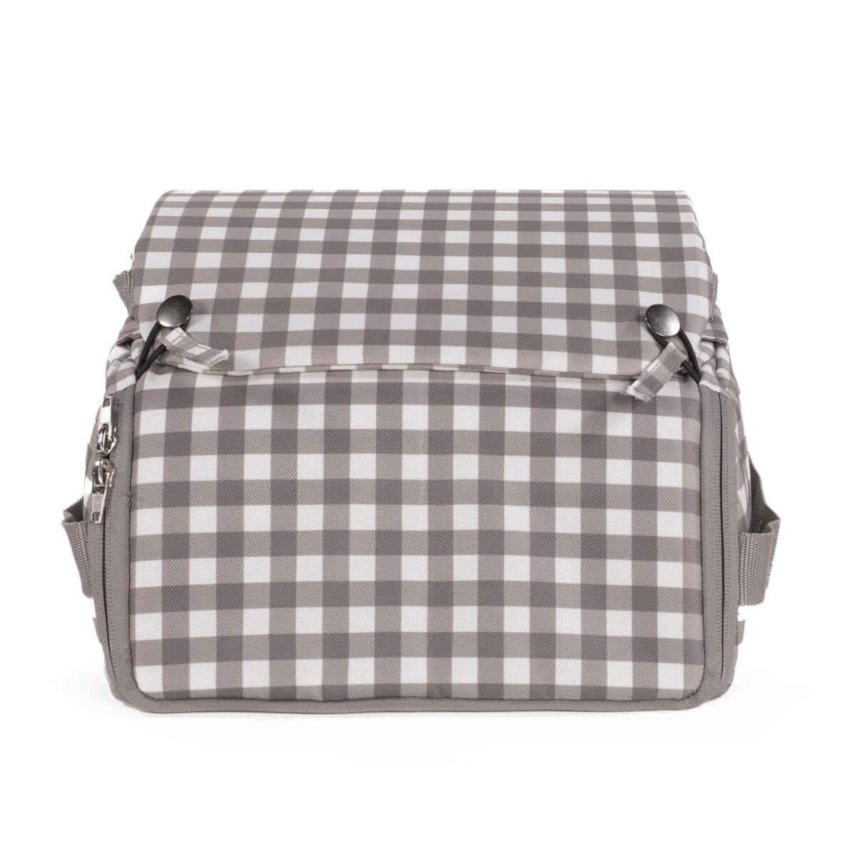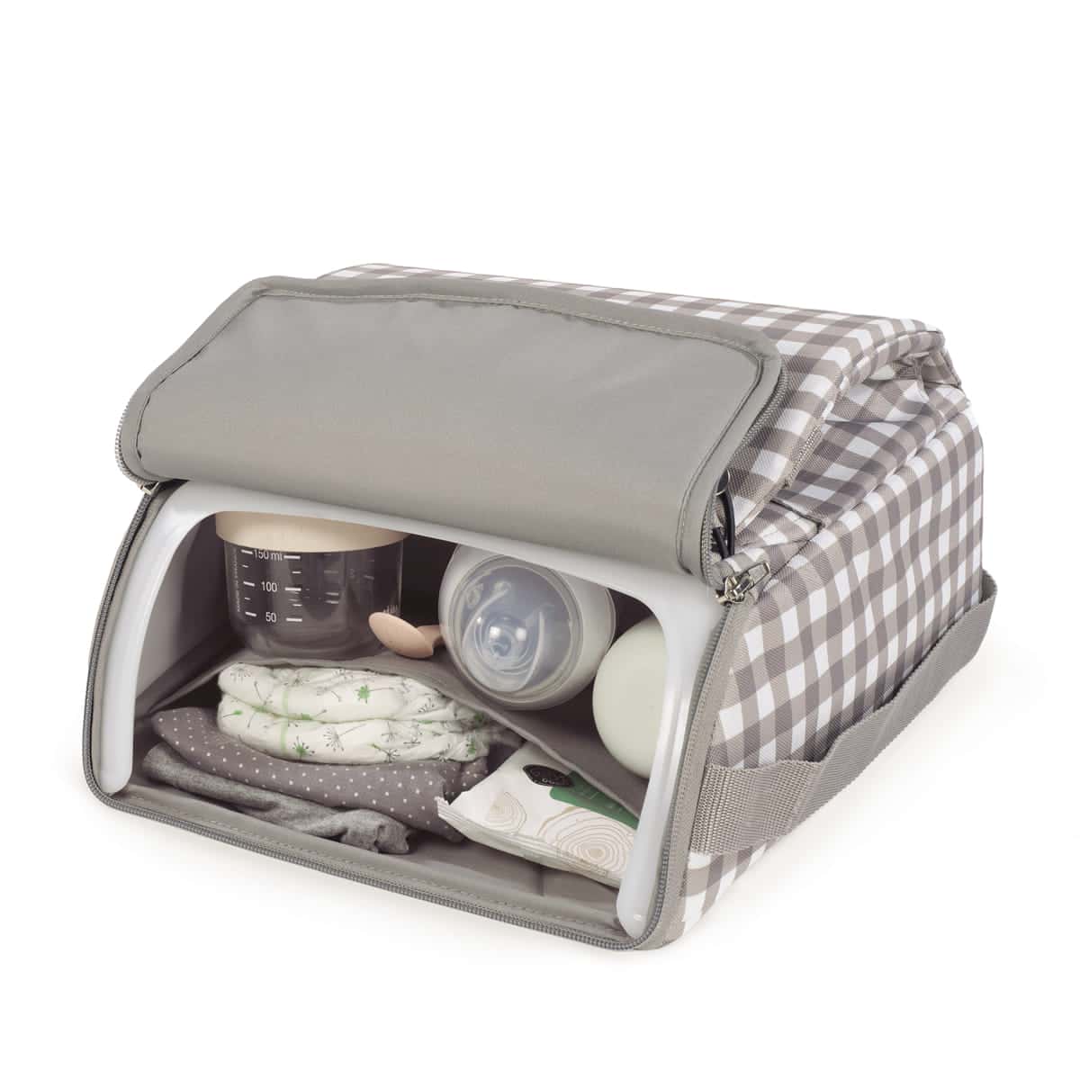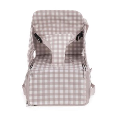 Possui alça de ombro para transporte confortável. Inclui um compartimento de armazenamento na base, perfeito para guardar fraldas, toalhitas ou outros essenciais para o bebé. Adapta-se à maioria das cadeiras para adultos, oferecendo versatilidade e conforto numa variedade de ambientes. Inclui alças ajustáveis para fixação rápida e segura ao encosto e ao assento.