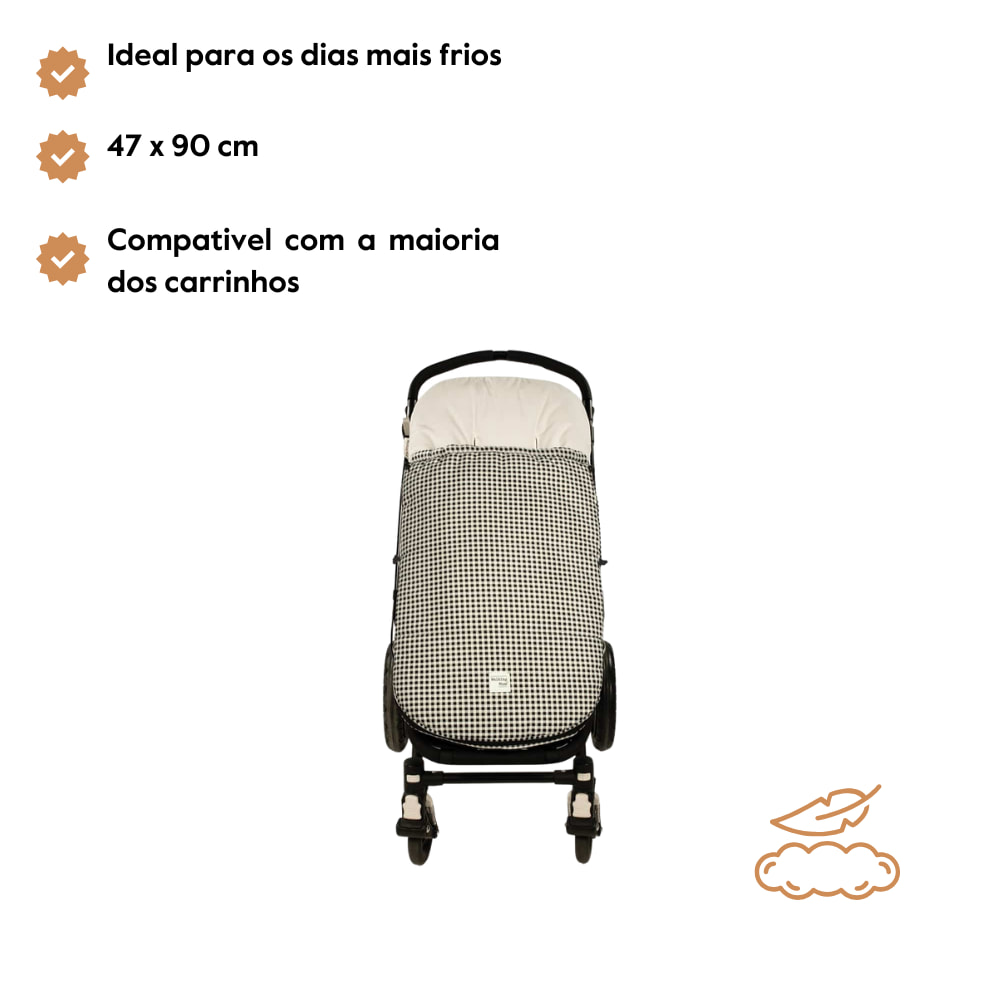 Com um design que incorpora várias aberturas (ilhos) e ajustes, a instalação é fácil e a adaptação à maioria dos carrinhos é garantida. Confeccionada com um material resistente e quente, cria um verdadeiro ninho acolhedor para o seu bebé. Possui uma base plastificada no apoio para os pés, facilitando a limpeza após o uso e prevenindo a acumulação de sujidade. O saco adapta-se perfeitamente, permitindo que o bebé desfrute de um descanso mais agradável.