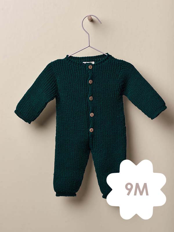Macacão de manga comprida tricotado em malha de lã merino suave, ideal para bebés meninos e meninas, até aos 12 meses. O macacão aperta na frente com botões de côco e entre as pernas com molas. Produzido em Wholegarment, uma peça completa sem costuras, para maior conforto do seu bebé.
