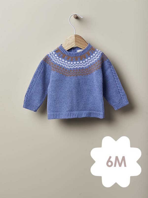 Camisola em jacquard tricotada em malha fina numa mistura suave de lã merino e caxemira, ideal para bebés até aos 6 meses. A camisola aperta nas costas com botões de côco. Produzido em Wholegarment, uma peça completa sem costuras, para maior conforto do seu bebé.