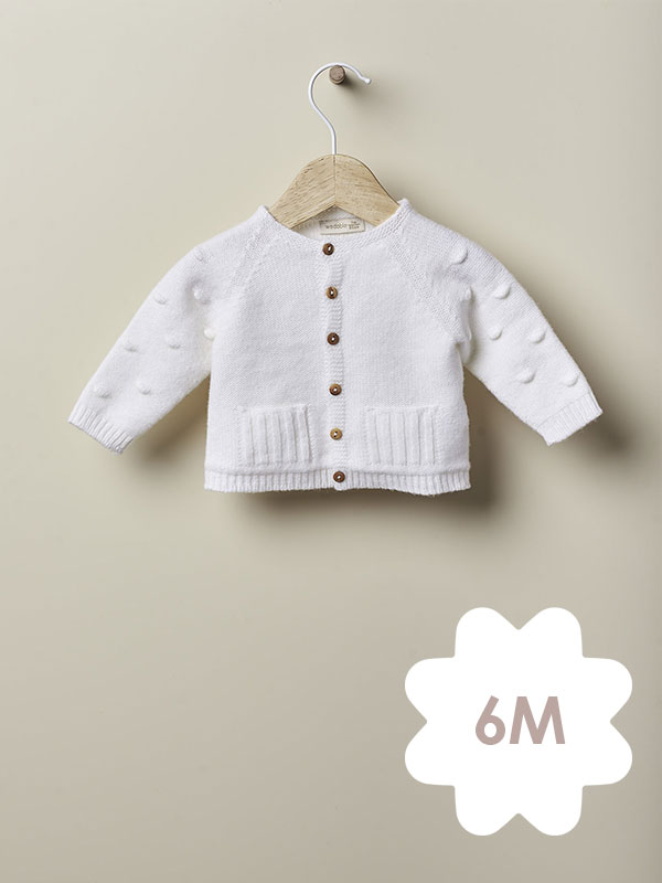 Casaco tricotado numa mistura suave de lã merino e caxemira, ideal para bebés até aos 6 meses. O casaco de manga comprida com pequenos pompons tricotados e carácter único da peça, tem dois bolsos e aperta na frente com botões de madeira. Produzido em Wholegarment, uma peça completa sem costuras, para maior conforto do seu bebé.